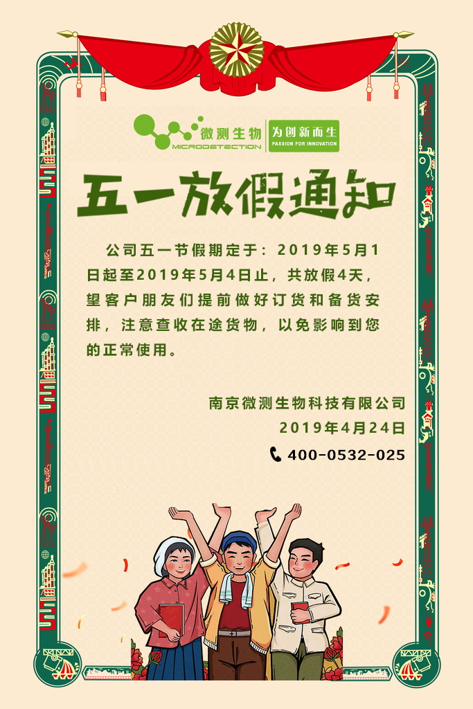 公司五一勞動(dòng)節(jié)假期定于:2019年5月1日起至2019年5月4日止,共放假4天,望客戶朋友們提前做好訂貨和備貨安排,注意查收在途貨物,以免影響到您的正常使用。